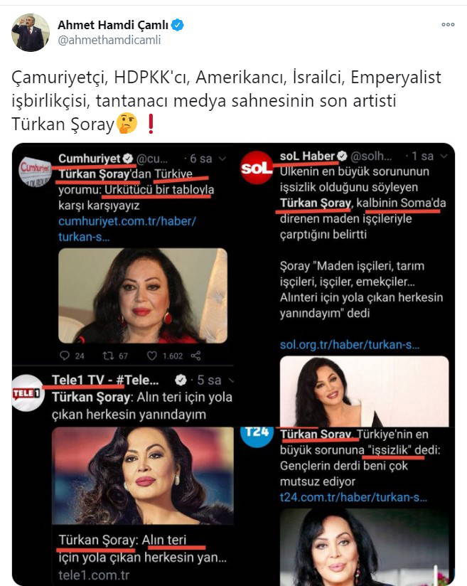 Çamlı, Twitter hesabından yaptığı paylaşımda Türkan Şoray'ın sözlerinin yer aldığı haber görsellerine yer vererek, "Çamuriyetçi, HDPKK'cı, Amerikancı, İsrailci, Emperyalist işbirlikçisi, tantanacı medya sahnesinin son artisti Türkan Şoray" ifadelerini kullandı.