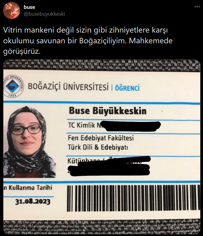 Boğaziçi Üniversitesi öğrencisi Buse Büyükkeskin'i kendisini hedef alan Ardıç'a yanıt vererek, "Vitrin mankeni değil sizin gibi zihniyetlere karşı okulumu savunan bir Boğaziçiliyim. Mahkemede görüşürüz" notunu düştü.