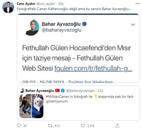 Aydın, sosyal medya hesabı üzerinden, Bahar Ayvazoğlu’nun 2013 yılında Twitter hesabı üzerinden Fethullah Gülen’in Web sitesi üzerinden Gülen'in bir "taziye" mesajını paylaştığı bir tweeti hatırlatarak “Fotoğraftaki Canan Kaftancıoğlu değil ama bu sensin Bahar Ayvazoğlu…” ifadesini kullandı.