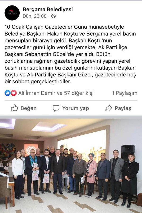 Öte yandan, Bergama Belediyesi, Çalışan Gazeteciler Günü'nü kutlayan bir mesaj yayımladı.