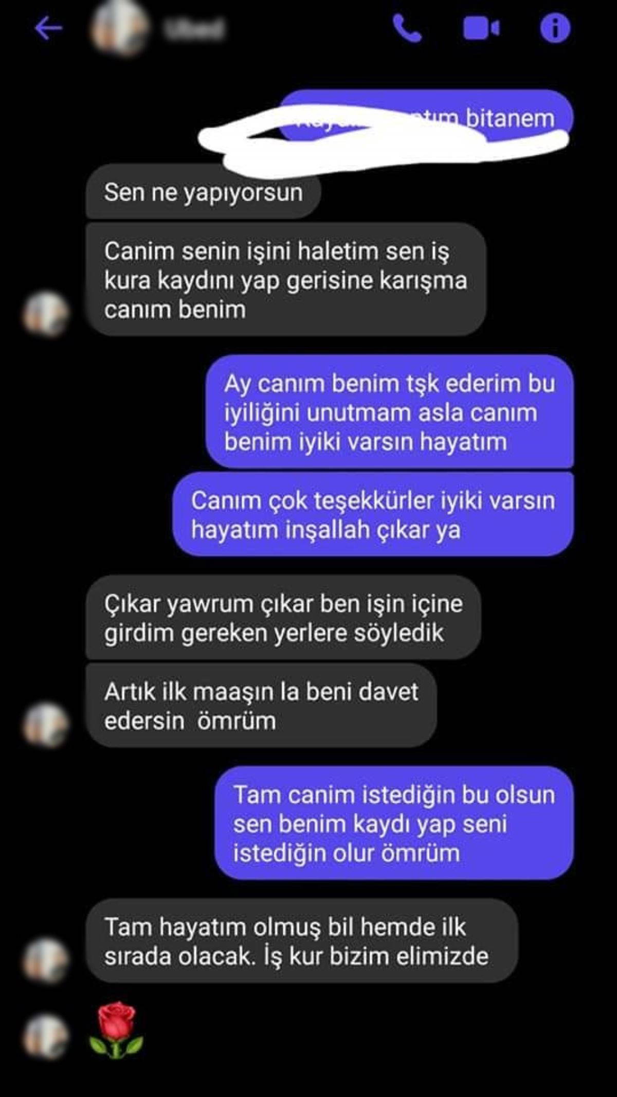 U.U.'yla söz konusu kişinin mesajlaşması “Canım senin işini hallettim. Sen İŞKUR’a kaydını yap gerisine karışma canım benim” sözleriyle başlıyor. Konuştuğu kişinin devamında U.U.'ya, “Hayatım inşallah çıkar ya” derken U.U. ise ona cevaben, “Çıkar yavrum işin içine ben girdim. Gereken yerlere söyledik” diyor. Başkanın yeğeni U.U., konuşmada ayrıca “Tamam hayatım olmuş bil hem ilk sırada olacak. İŞKUR bizim elimizde” ifadelerini kullanıyor.