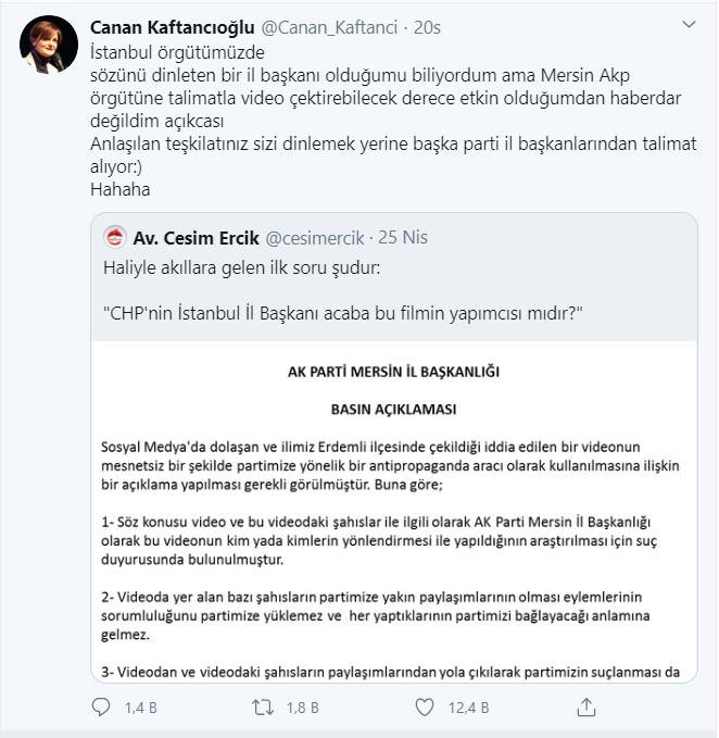Çekilen videonun “kumpas” olduğunu öne süren ve “CHP'nin İstanbul İl Başkanı acaba bu filmin yapımcısı mıdır?” diyen Mersin AKP İl Başkanı Cesim Ercik için Kaftancıoğlu, “Anlaşılan teşkilatınız sizi dinlemek yerine başka parti il başkanlarından talimat alıyor” dedi.