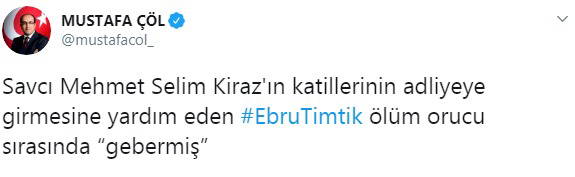 Çöl, sosyal medya hesabından, "Savcı Mehmet Selim Kiraz'ın katillerinin adliyeye girmesine yardım eden #EbruTimtik ölüm orucu sırasında “gebermiş” ifadelerini paylaştı.