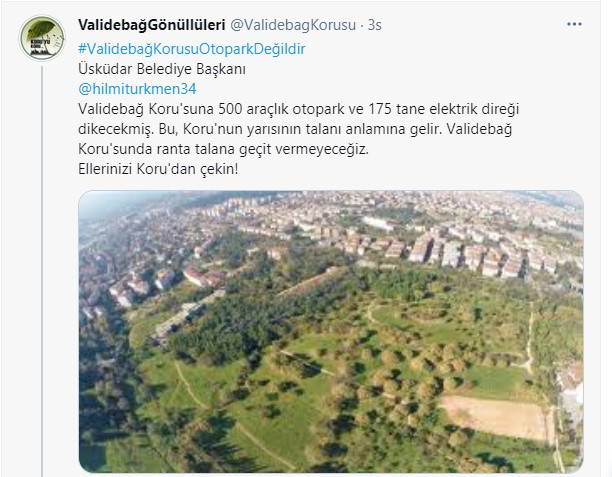 "Validebağ'da yeşili hançerleyerek futbol sahası yaptıkları yere Üsküdar belediyesi "Rehabilitasyon projesi" adı altında şimdi de 500 araçlık otopark yapacakmış. Üsküdar Belediye Başkanı Hilmi Türkmen, Validebağ Koru'suna 500 araçlık otopark ve 175 tane elektrik direği dikecekmiş. Bu, Koru'nun yarısının talanı anlamına gelir. Validebağ Korusu'nda ranta talana geçit vermeyeceğiz. Ellerinizi korudan çekin!"