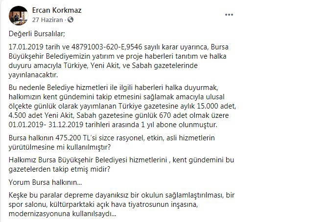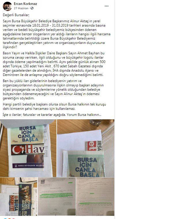 Öte yandan, CHP Bursa Büyükşehir Belediye Meclis Üyesi ve CHP Osmangazi Belediye Meclis Üyesi Ercan Korkmaz da yaşanan ballı medya dağıtımlarını Haziran ayında kişisel Facebook hesabından paylaştığı görüldü.