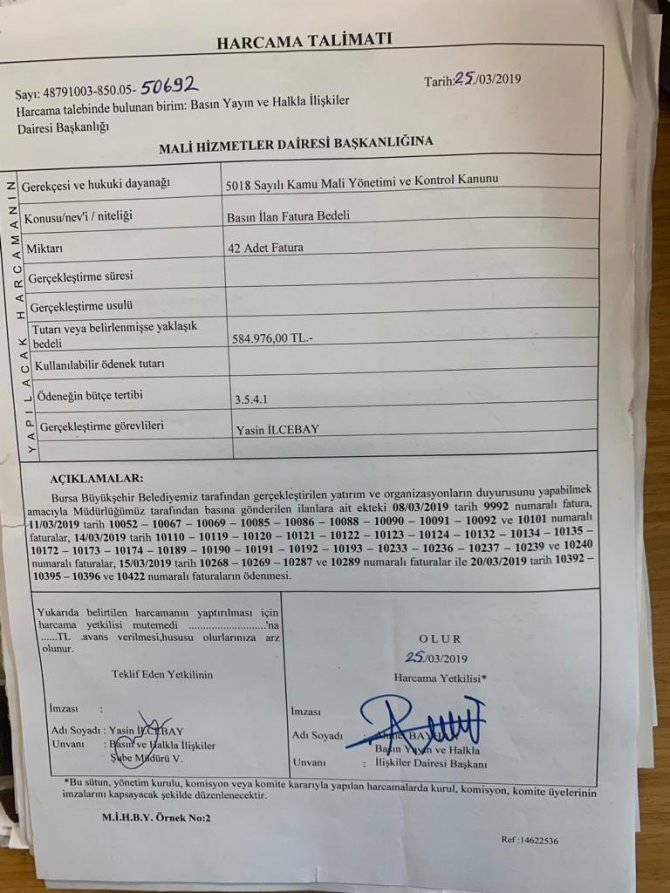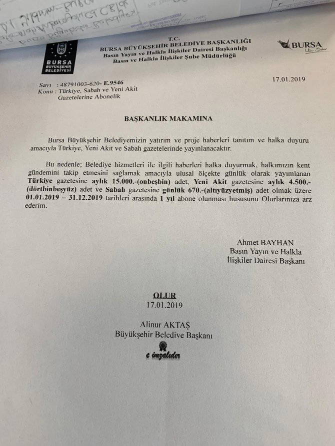 Söz konusu medya dağıtımlarında, “Bursa Büyükşehir Belediyemizin yatırım ve proje haberleri tanıtım ve halka duyuru amacıyla Türkiye, Yeni Akit ve Sabah gazetelerinde yayınlanacaktır.Bu nedenle; Belediye hizmetleri ile ilgili haberleri halka duyurmak, halkımızın kent gündemini takip etmesini sağlamak amacıyla ulusal ölçekte günlük olarak yayımlanan Türkiye gazetesine aylık 15.000.-(onbeşbin) adet, Yeni Akit gazetesine aylık 4.500.(dörtbinbeşyüz) adet ve Sabah gazetesine günlük 670.-(altıyüzyetmiş) adet olmak üzere 01.01.2019 - 31.12.2019 tarihleri arasında 1 yıl abone olunması hususunu Olurlarınıza arz ederim” ifadeleri kullanıldığı görüldü.