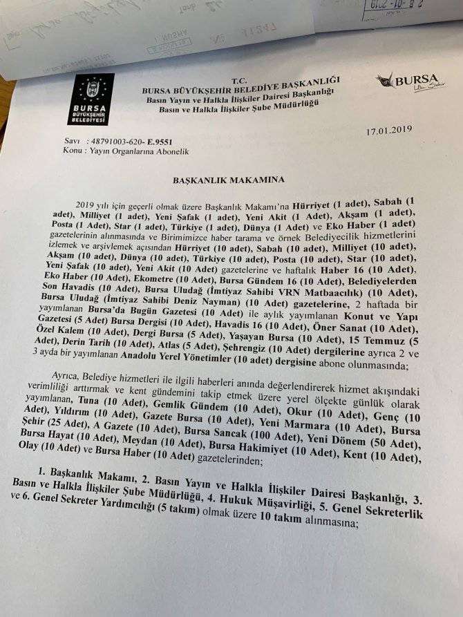 AKP’li Bursa Büyükşehir Belediyesi’nin 01.01.2019-31.12.2019 tarihleri arasında Türkiye Gazetesi’ne aylık 15 bin, Yeni Akit Gazetesi’ne aylık 4500 ve Sabah Gazetesi’ne ise günlük 670 gazeteden aylık toplamda 20 bin 100 gazete aldığı ortaya çıktı.