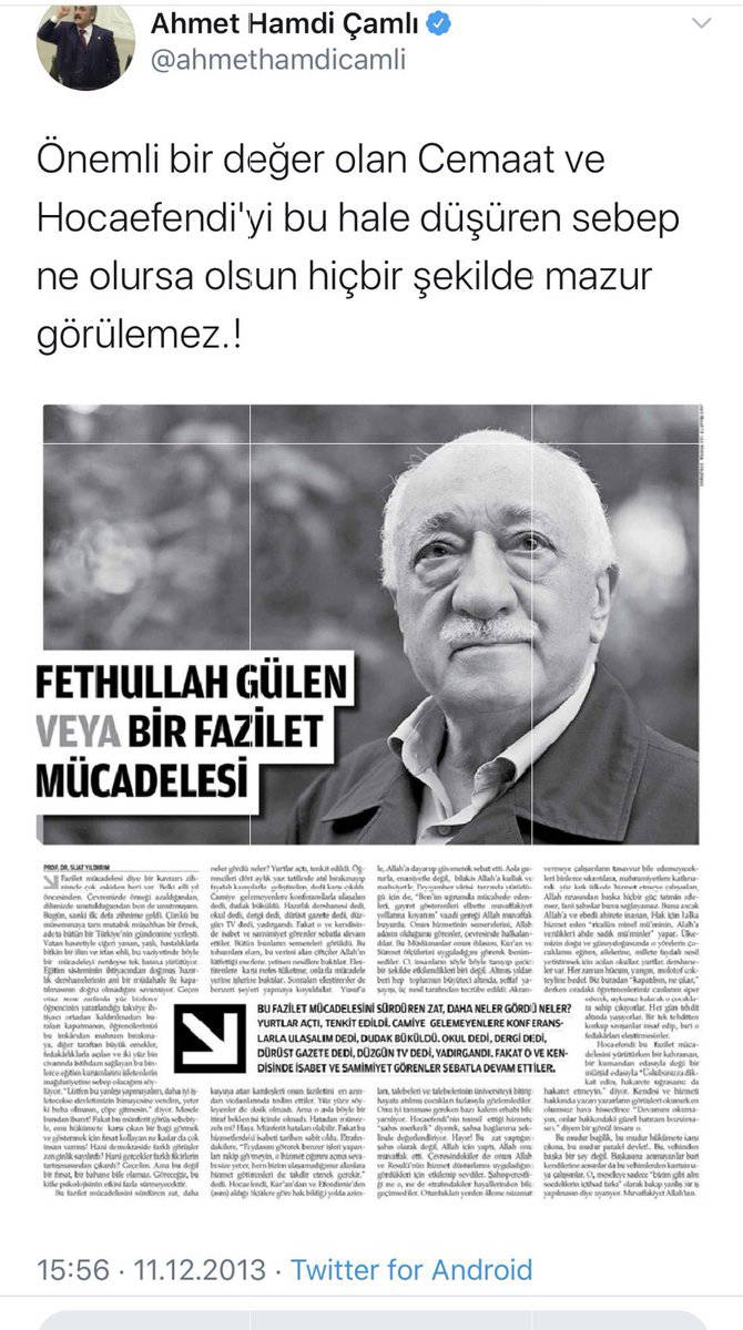 Nihal Olçok'un "buldum" dediği paylaşım, yurt dışına kaçtığı belirtilen Prof. Dr. Suat Yıldırım'ın "Fethullah Gülen veya Bir Fazilet Mücadelesi" başlıklı yazısını alıntılayan AKP'li vekil Ahmet Hamdi Çamlı'nın "Önemli bir değer olan Cemaat ve Hocaefendi'yi bu hale düşüren sebep ne olursa hiçbir şekilde mazur görülemez!" cümleleriydi.