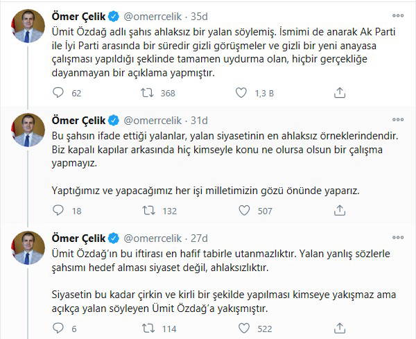 "Ümit Özdağ adlı şahıs ahlaksız bir yalan söylemiş. İsmimi de anarak Ak Parti ile İyi Parti arasında bir süredir gizli görüşmeler ve gizli bir yeni anayasa çalışması yapıldığı şeklinde tamamen uydurma olan, hiçbir gerçekliğe dayanmayan bir açıklama yapmıştır.