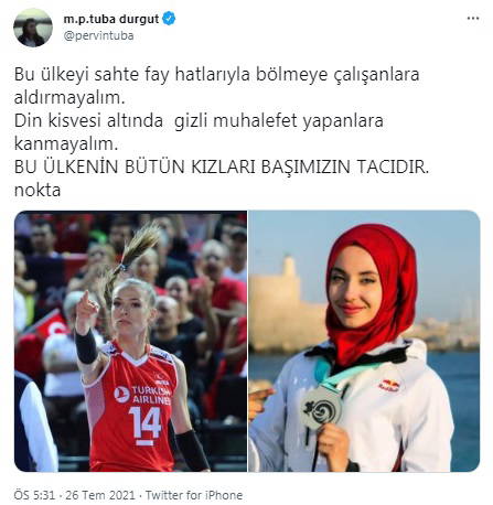 Konuyla ilgili tepkilerin giderek büyüyüp gündem haline gelmesinin ardından bugün AKP'den de Şenocak'a bir tepki geldi. AKP İstanbul Milletvekili ve TBMM Sağlık, Aile, Çalışma ve Sosyal İşler Komisyonu Başkan Vekili Tuba Durgut, Twitter üzerinden yaptığı ve A Milli Kadın Voleybol Takımı’nda kaptan Eda Erdem Dündar ile milli tekvandocu Kübra Dağlı'nın fotoğraflarını paylaştığı tweet'inde Şenocak'a yönelik isim vermeden şöyle dedi: