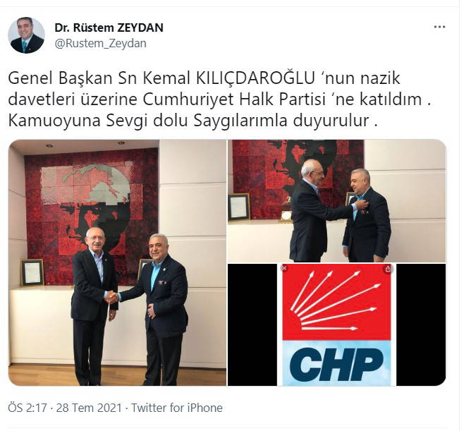 Twitter üzerinden yaptığı açıklamada, CHP Genel Başkanı Kemal Kılıçdaroğlu’ndan gelen davet üzerine CHP’ye geçtiğini belirten Zeydan, “Genel Başkan Sn. Kemal Kılıçdaroğlu‘nun nazik davetleri üzerine Cumhuriyet Halk Partisi‘ne katıldım. Kamuoyuna sevgi dolu saygılarımla duyurulur” açıklamasında bulundu.