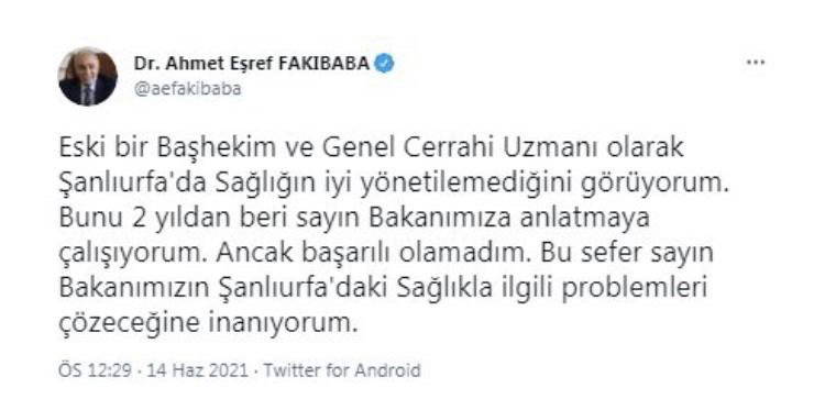 AKP'li vekil Fakıbaba, sosyal medyadan yaptığı paylaşımla Şanlıurfa İl Sağlık Müdürü Doç. Dr. Emre Erkuş'u Sağlık Bakanı Koca'ya şikayet etti. Fakıbaba mesajında, “Eski bir başhekim ve genel cerrahı uzmanı olarak Şanlıurfa'da sağlığın iyi yönetilmediğini görüyorum. Bunu iki yıldan beri sayın bakanımıza anlatmaya çalışıyorum. Ancak, başarılı olamadım. Bu sefer sayın bakanımızın Şanlıurfa'daki sağlıkla ilgili problemleri çözeceğine inanıyorum” ifadelerini kullandı.