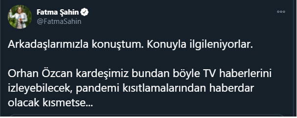 Fatma Şahin konuyla ilgili attığı tweette, "Arkadaşlarımızla konuştum. Konuyla ilgileniyorlar. Orhan Özcan kardeşimiz bundan böyle TV haberlerini izleyebilecek, pandemi kısıtlamalarından haberdar olacak kısmetse..." dedi.