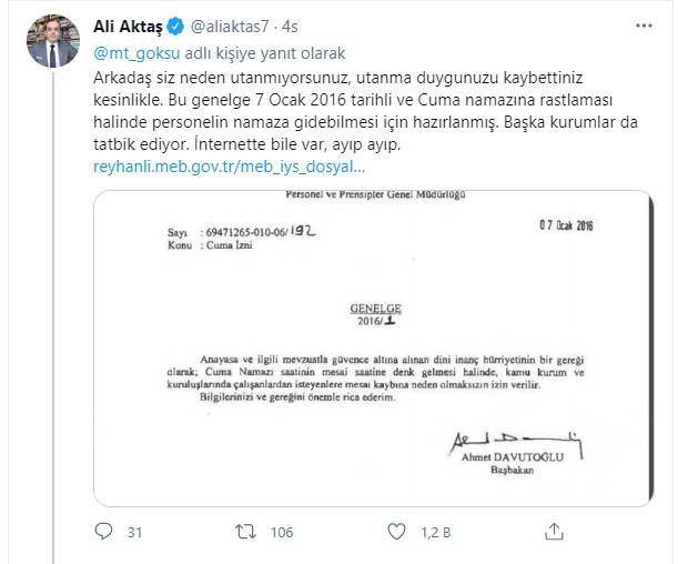 Göksu'ya yanıt Saadet Partili Ali Aktaş'tan geldi. Göksu'ya, "Arkadaş siz neden utanmıyorsunuz" diye soran Aktaş, "Utanma duygunuzu kaybettiniz kesinlikle. Bu genelge 7 Ocak 2016 tarihli ve cuma namazına rastlaması halinde personelin namaza gidebilmesi için hazırlanmış. Başka kurumlar da tatbik ediyor. İnternette bile var, ayıp ayıp" şeklinde tepki gösterdi.