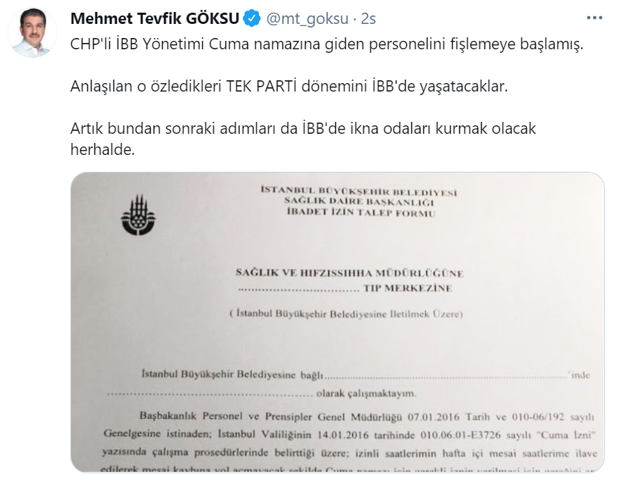 Hazırlanan ibadet talep formunda 2016'daki karar gereği, İBB'de çalışan personel cuma namazı için talebi yer alıyor. AKP döneminde de söz konusu uygulamanın olduğu bilinmesine rağmen Göksu, CHP yönetimindeki İBB Başkanlığı'nı 'fişleme' yapmakla suçladı.