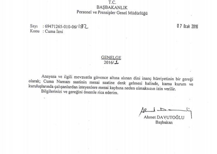 Ahmet Davutoğlu'nun Başbakan olduğu dönemde çıkardığı 7 Ocak 2016 tarihli genelgede, cuma namazına denk gelmesi halinde personelin namaza gidebilmesi için düzenlemeye gidildi.
