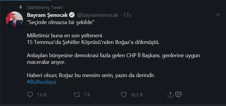 Bayram Şenocak, sosyal medya hesabından yaptığı paylaşımda, “’Seçimle olmazsa bir şekilde’ Milletimiz buna en son yelteneni 15 Temmuz’da Şehitler Köprüsü’nden Boğaz’a dökmüştü. Anlaşılan bünyesine demokrasi fazla gelen CHP İl Başkanı, genlerine uygun maceralar arıyor. Haberi olsun; Boğaz bu mevsim serin, yazın da derindir” ifadelerini kullandı.