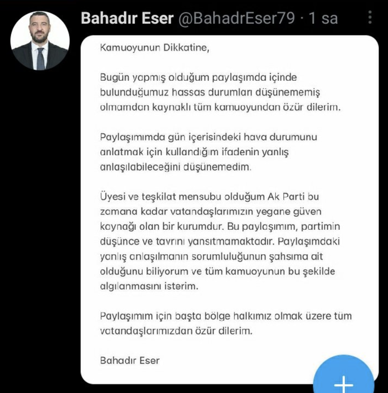 AKP Büyükçekmece İlçe Yönetim Kurulu Üyesi Bahadır Eser'in sosyal medya paylaşımı tepkilere neden oldu.