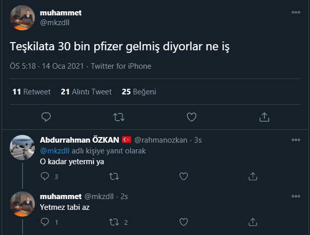 Türkiye pandemiyle mücadelede aşılanma takvimini hayata geçirdi. Bu kapsamda ilk aşıyı Sağlık Bakanı Fahrettin Koca ve Bilim Kurul üyeleri olurken, AKP'li Cumhurbaşkanı Recep Tayyip Erdoğan da bugün aşı oldu. Fakat AKP MKYK üyelerinin Erdoğan ile birlikte aşı olmalarına tepkiler dinmemişken iki AKP’li ismin Twitter üzerinden girdikleri diyalog şüpheleri ve tepkileri artırdı.