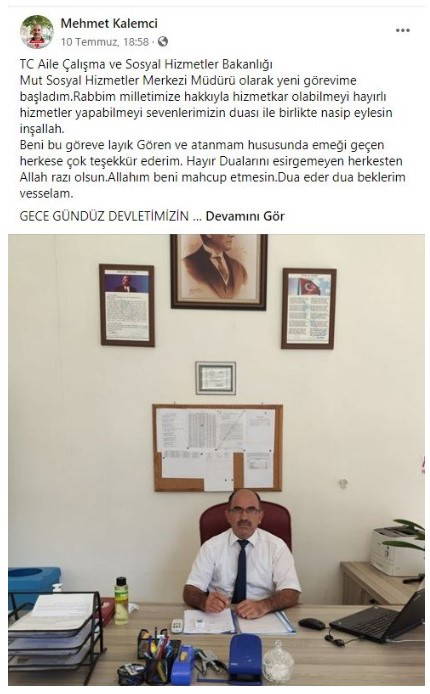 "T.C. Aile Çalışma ve Sosyal Hizmetler Bakanlığı Mut Sosyal Hizmetler Merkezi Müdürü olarak yeni görevime başladım. Rabbim milletimize hakkıyla hizmetkâr olabilmeyi hayırlı hizmetler yapabilmeyi sevenlerimizin duası ile birlikte nasip eylesin inşallah.