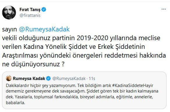 Kadak'ın paylaşımına verilen yanıtlarda, 'Kadına yönelik şiddet araştırılsın' önergesinin MHP ve AKP'nin oylarıyla reddedilmesine ilişkin haber de sıklıkkla hatırlatıldı.