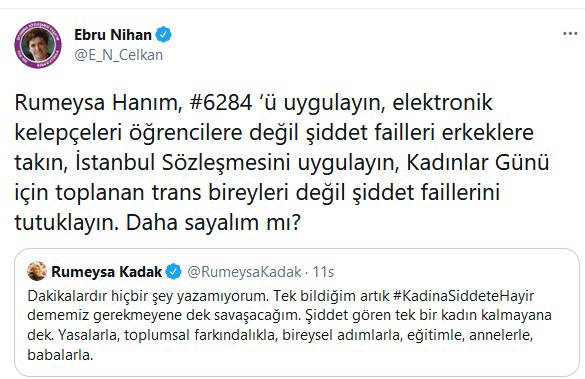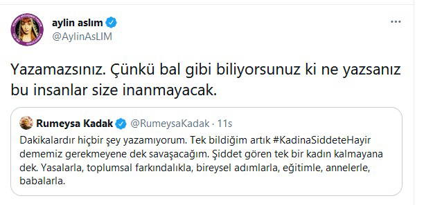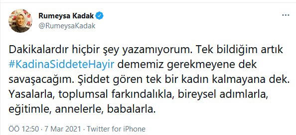 Kadak, paylaşımında, "Dakikalardır hiçbir şey yazamıyorum. Tek bildiğim artık #KadinaSiddeteHayir dememiz gerekmeyene dek savaşacağım. Şiddet gören tek bir kadın kalmayana dek. Yasalarla, toplumsal farkındalıkla, bireysel adımlarla, eğitimle, annelerle, babalarla." ifadelerini kullandı.