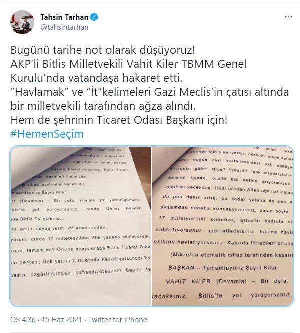 Bugünü tarihe not olarak düşüyoruz! AKP’li Bitlis Milletvekili Vahit Kiler TBMM Genel Kurulu’nda vatandaşa hakaret etti. “Havlamak” ve “İt”kelimeleri Gazi Meclis’in çatısı altında bir milletvekili tarafından ağza alındı. Hem de şehrinin Ticaret Odası Başkanı için!