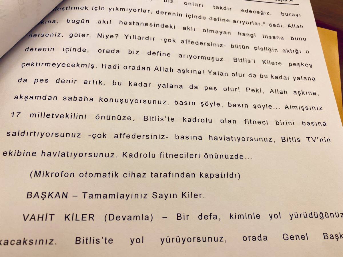 TBMM'de konuşan AKP'li Vahit Kiler, Bitlis Ticaret Odası Başkanı'nı türcü hakaretlerle hedef aldı. Bitlis Ticaret ve Sanayi Odası (TSO) Başkanı Davut Tezcan'ı işaret eden AKP'li Kiler, "Almışsınız 17 milletvekilini önünüze, Bitlis'te kadrolu olan fitneci birine saldırtıyorsunuz -çok afedersiniz- havlatıyorsunuz. Bitlis TV'nin ekibine havlatıyorsunuz" sözlerini sarf etti.