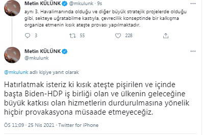 AKP'li Cumhurbaşkanı Recep Tayyip Erdoğan'a yakınlığı ve işadamı kimliğiyle bilinen AKP MKYK Üyesi Metin Külünk, doğa nöbeti tutan ve Cengiz İnşaat’a ait iş makinelerinin önünde duran köylülerin eyleminin HDP üzerinden ABD Başkanı Joe Biden tarafından yönlendirildiğini öne sürdü.