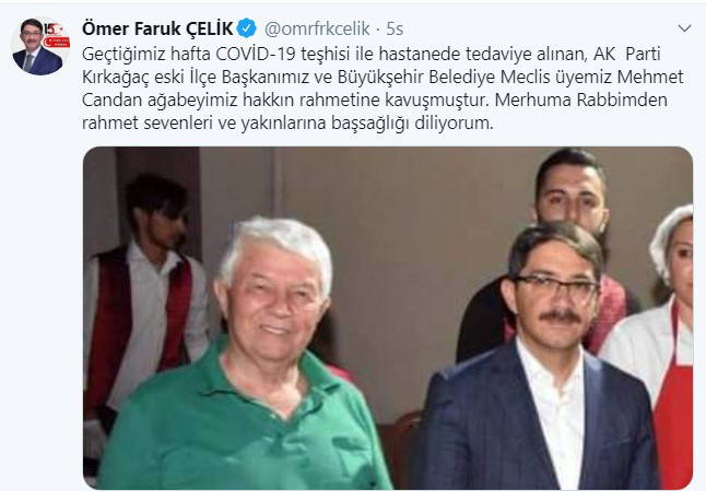 AKP'li Şehzadeler Belediye Başkanı Ömer Faruk Çelik, sosyal medya hesabından “Geçtiğimiz hafta COVID-19 teşhisi ile hastanede tedaviye alınan, AK Parti Kırkağaç eski İlçe Başkanımız ve Büyükşehir Belediye Meclis üyemiz Mehmet Candan ağabeyimiz hakkın rahmetine kavuşmuştur. Merhuma Rabbimden rahmet sevenleri ve yakınlarına başsağlığı diliyorum” ifadelerini kullandı.