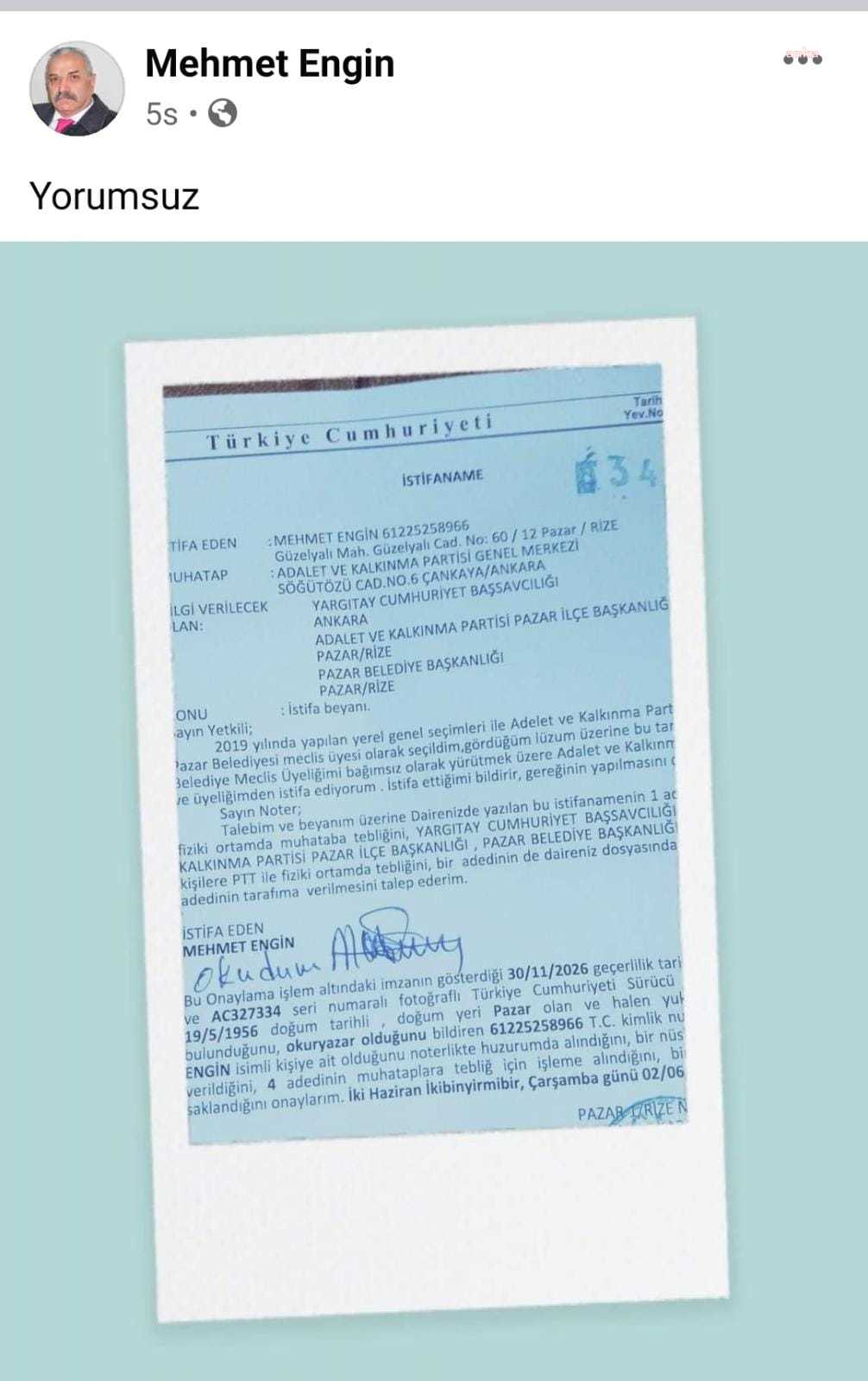 Mehmet Engin, Noter aracılığı ile verdiği istifa dilekçesinde “2019 yılında yapılan yerel genel seçimleri ile Adalet ve Kalkınma Partisi listesinden Pazar Belediyesi meclis üyesi olarak seçildim. Gördüğüm lüzum üzerine bu tarihten itibaren Belediye Meclis Üyeliğimi bağımsız olarak yürütmek üzere Adalet ve Kalkınma Partisinden ve üyeliğimden istifa ediyorum. İstifa ettiğimi bildirir, gereğinin yapılmasını dilerim” ifadelerini kullandı.