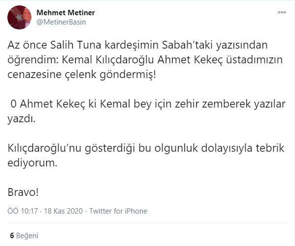 "Az önce Salih Tuna kardeşimin Sabah’taki yazısından öğrendim: Kemal Kılıçdaroğlu Ahmet Kekeç üstadımızın cenazesine çelenk göndermiş! 0 Ahmet Kekeç ki Kemal Bey için zehir zemberek yazılar yazdı. Kılıçdaroğlu’nu gösterdiği bu olgunluk dolayısıyla tebrik ediyorum. Bravo!"