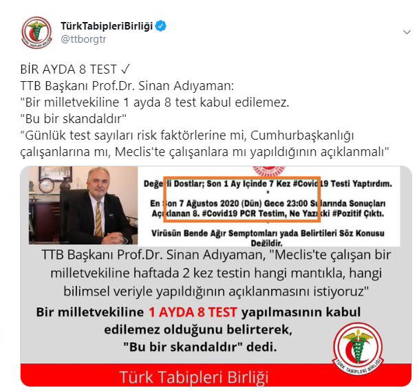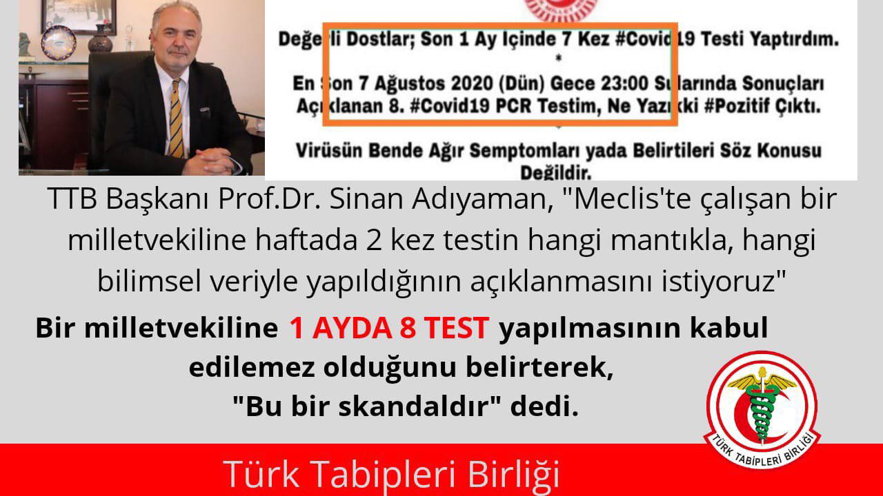 TTB Başkanı Prof. Dr. Sinan Adıyaman yayınladığı bir basın açıklamasıyla AKP'li Türkoğlu'nun yaptırdığı 8 testin adil ve kabul edilir olmadığını ifade etti. "Bir milletvekiline bir ay içerisinde uygulanan 8 test kabul edilemez" diyen Prof. Dr. Adıyaman, olayı, "Bu bir skandaldır" sözleriyle niteledi.