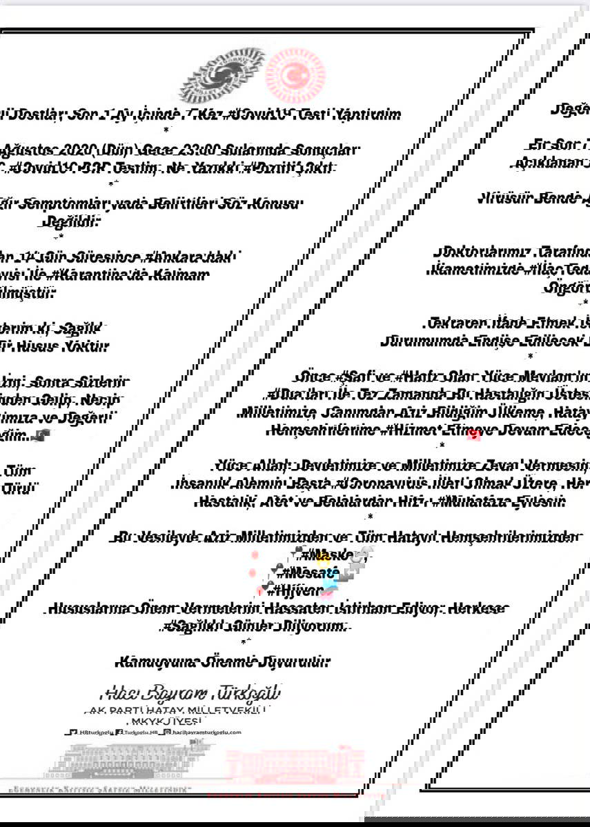 AKP Hatay Milletvekili Hacı Bayram Türkoğlu'nun kendisine yaptırdığı 8 Covid-19 testinin pozitif çıktığını ifade etmesinin ardından Türk Tabipler Birliği'nden (TTB) tepki geldi.