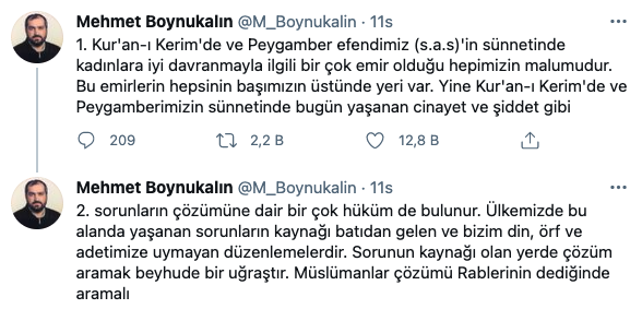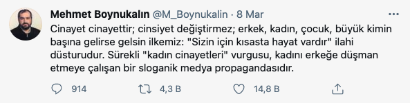 “Cinayet cinayettir; cinsiyet değiştirmez; erkek, kadın, çocuk, büyük kimin başına gelirse gelsin ilkemiz: "Sizin için kısasta hayat vardır" ilahi düsturudur. Sürekli ‘kadın cinayetleri’ vurgusu, kadını erkeğe düşman etmeye çalışan bir sloganik medya propagandasıdır.