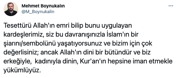 “Tesettürü Allah'ın emri bilip bunu uygulayan kardeşlerimiz, siz bu davranışınızla İslam'ın bir şiarını/sembolünü yaşatıyorsunuz ve bizim için çok değerlisiniz; ancak Allah'ın dini bir bütündür ve biz erkeğiyle, kadınıyla dinin, Kur'an'ın hepsine iman etmekle yükümlüyüz.