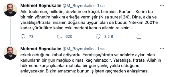 Aile toplumun, milletin, devletin en küçük birimidir. Kur'an-ı Kerim bu birimin yönetim hakkını erkeğe vermiştir (Nisa suresi 34). Dine, akla ve yaratılışa/fıtrata, insanın doğasına uygun olan da budur. Nitekim 2001'e kadar yürürlükte kalan eski medeni kanun ailenin reisinin erkek olduğunu kabul ediyordu. Yaratılışa/fıtrata ve adalete aykırı olan kanunların bir gün mağlup olması kaçınılmazdır. Yaratılışa, fıtrata, Allah’ın hükmüne karşı çıkanlar mutlaka bir gün yanlış yolda olduğunu anlayacaktır. Bizim amacımız bunun iş işten geçmeden anlaşılması.”