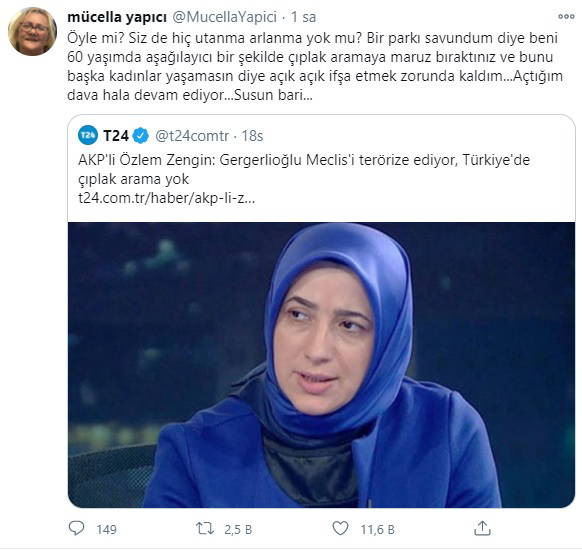 Gezi Parkı davasında yargılanan Mücella Yapıcı, Özlem Zengin'in açıklamalarına, "Bir parkı savundum diye beni 60 yaşımda aşağılayıcı bir şekilde çıplak aramaya maruz bıraktınız ve bunu başka kadınlar yaşamasın diye açık açık ifşa etmek zorunda kaldım" şeklinde yanıt verdi.
