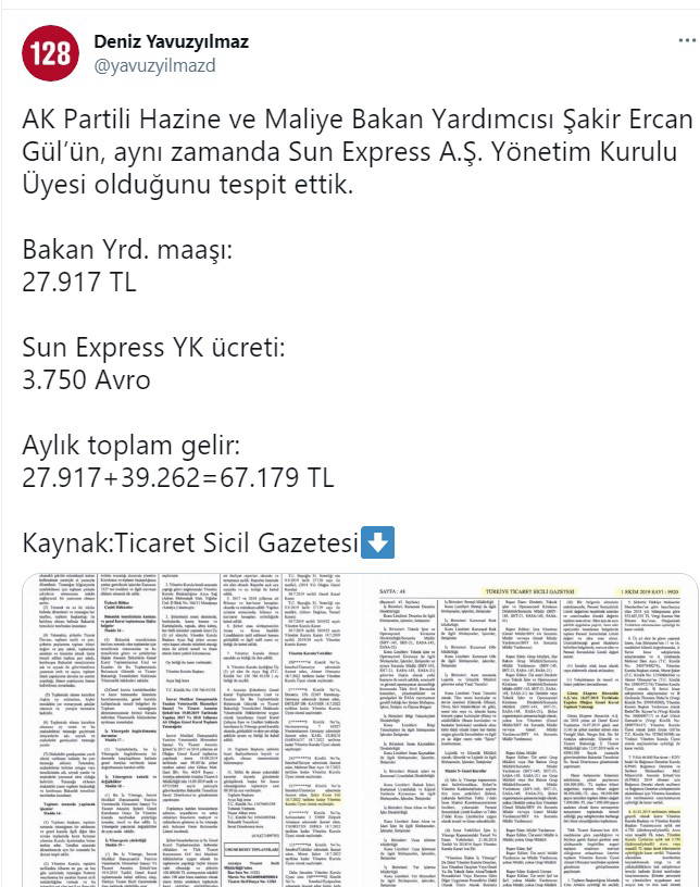Yavuzyılmaz, ''AK Partili Hazine ve Maliye Bakan Yardımcısı Şakir Ercan Gül’ün, aynı zamanda Sun Express A.Ş. Yönetim Kurulu Üyesi olduğunu tespit ettik. Bakan Yardımcılığı maaşı: 27 bin 917 TL. Sun Express Yönetim Kurulu ücreti: 3 bin 750 Avro. Aylık toplam gelir: 27 bin 917+39 bin 262=67 bin 179 TL '' paylaşımını yaptı.