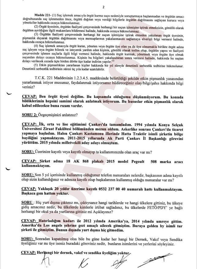 Polislerin “etkin pişmanlıktan” yararlanmak isteyip istemediğini sorduğu AKP’li vekil Çivitçioğlu, “Ben örgüt üyesi değilim. Bu kapsamda olduğumu düşünmüyorum. Bu konuda bildiklerimin hepsini samimim olarak anlatmak istiyorum. Bu hususlar etkin pişmanlık oalrak kabul edilecekse buna rızam vardır” diye yanıt verdi.