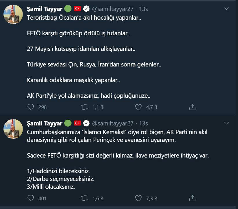 “Erdoğan İslami Kemalist oldu’ diyen Perinçek'i dün akşam Twitter hesabından hedef alan Şamil Tayyar, "Cumhurbaşkanımıza ‘İslamcı Kemalist’ diye rol biçen, AK Parti’nin akıl danesiymiş gibi rol çalan Perinçek ve avanesini uyarayım" diye yazdı.