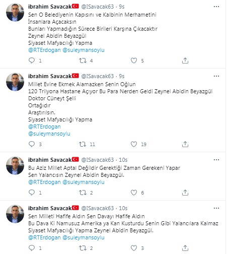 İşte AKP'li İbrahim Savacak'ın Beyazgül'ü hedef alarak yaptığı paylaşımlardan bazıları: