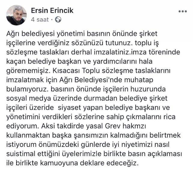 “Ağrı belediyesi yönetimi basının önünde şirket işçilerine verdiğiniz sözünüzü tutunuz. toplu iş sözleşme taslakları derhal imzalatiniz. imza töreninde kaçan belediye başkan ve yardımcılarını hala görememişiz. Kısacası Toplu sözleşme taslaklarını imzalatmak için Ağrı Belediyesi'nde muhatap bulamıyoruz. basının önünde işçilerin huzurunda sosyal medya üzerinde durmadan belediye şirket işçileri üzeride siyaset yapan belediye başkanı ve yönetimini verdikleri sözlerine sahip çıkmalarını rica ediyorum. Aksi takdirde yasal Grev hakkımızı kullanmaktan başka şansımızın kalmadığını belirtmek istiyorum önümüzdeki günlerde iyi niyetimizi nasıl suistimal ettiğini üyelerimizle birlikte basın açıklaması ile birlikte kamuoyuna deklare edeceğiz.”