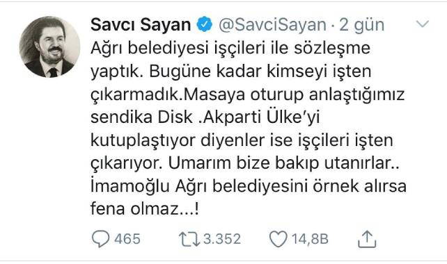 İBB’den çıkarılan işçilerle ilgili Ağrı Belediyesi Başkanı AKP’li Savcı Sayan’dan gelen mesajda “Ağrı belediyesi işçileri ile sözleşme yaptık. Bugüne kadar kimseyi işten çıkarmadık. Masaya oturup anlaştığımız sendika Disk. Akparti Ülke’yi kutuplaştıyor diyenler ise işçileri işten çıkarıyor. Umarım bize bakıp utanırlar.. İmamoğlu Ağrı belediyesini örnek alırsa fena olmaz...!” ifadeleri yer almıştı.