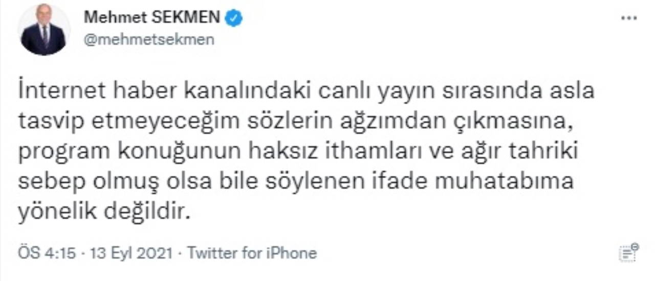 "İnternet haber kanalındaki canlı yayın sırasında asla tasvip etmeyeceğim sözlerin ağzımdan çıkmasına, program konuğunun haksız ithamları ve ağır tahriki sebep olmuş olsa bile söylenen ifade muhatabıma yönelik değildir."