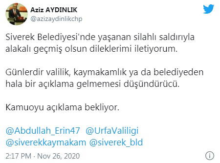 Olayın ardından CHP Şanlıurfa Milletvekili Aziz Aydınlık da, sosyal medya hesabından, “Siverek Belediyesi'nde yaşanan silahlı saldırıyla alakalı geçmiş olsun dileklerimi iletiyorum. Günlerdir valilik, kaymakamlık ya da belediyeden hala bir açıklama gelmemesi düşündürücü. Kamuoyu açıklama bekliyor” paylaşımında bulundu.