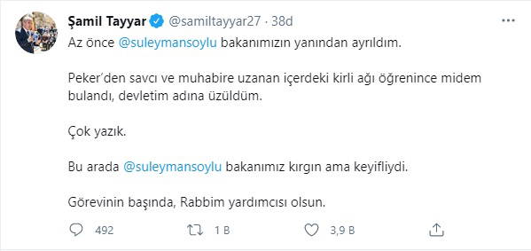 Tayyar, "Az önce @suleymansoylu bakanımızın yanından ayrıldım. Peker’den savcı ve muhabire uzanan içerdeki kirli ağı öğrenince midem bulandı, devletim adına üzüldüm. Çok yazık. Bu arada @suleymansoylu bakanımız kırgın ama keyifliydi. Görevinin başında, Rabbim yardımcısı olsun" ifadelerini kullandı.