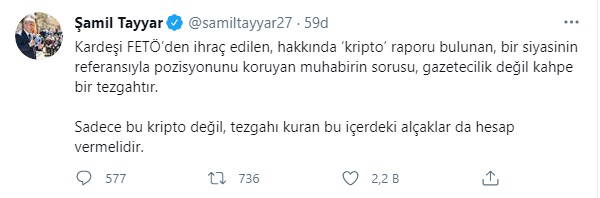 Kardeşi FETÖ’den ihraç edilen, hakkında ‘kripto’ raporu bulunan, bir siyasinin referansıyla pozisyonunu koruyan muhabirin sorusu, gazetecilik değil kahpe bir tezgahtır. Sadece bu kripto değil, tezgahı kuran bu içerdeki alçaklar da hesap vermelidir. Az önce @suleymansoylu bakanımızın yanından ayrıldım. Peker’den savcı ve muhabire uzanan içerdeki kirli ağı öğrenince midem bulandı, devletim adına üzüldüm. Çok yazık. Bu arada @suleymansoylu bakanımız kırgın ama keyifliydi. Görevinin başında, Rabbim yardımcısı olsun.