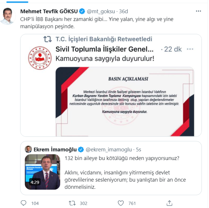Esenler Belediye Başkanı ve İBB AKP Grup Başkanvekili Tevfik Göksu, Twitter hesabından vakfın ihtiyaç sahibi ailelere kurban eti ulaştırmak üzere yapacağı yardım kampanyasıyla ilgili "CHP’li İBB Başkanı her zamanki gibi… Yine yalan, yine algı ve yine manipülasyon peşinde" paylaşımı yaptı.
