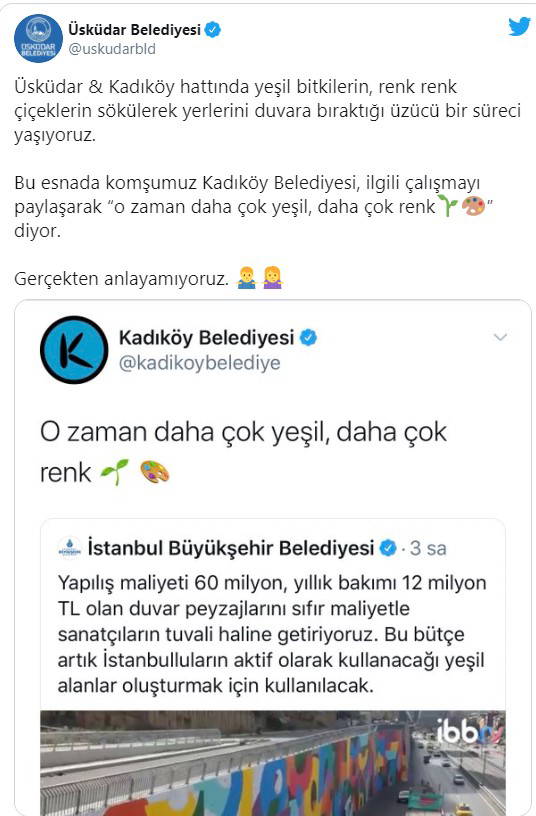 Kadıköy Belediyesi'nin İBB'nin söz konusu kararını "O zaman daha çok yeşil, daha çok renk" ifadeleriyle yorumlamasını eleştiren Üsküdar Belediyesi, Twitter hesabı üzerinden "Üsküdar & Kadıköy hattında yeşil bitkilerin, renk renk çiçeklerin sökülerek yerlerini duvara bıraktığı üzücü bir süreci yaşıyoruz. Bu esnada komşumuz Kadıköy Belediyesi, ilgili çalışmayı paylaşarak 'O zaman daha çok yeşil, daha çok renk' diyor. Gerçekten anlayamıyoruz" ifadeleriyle eleştirdi.